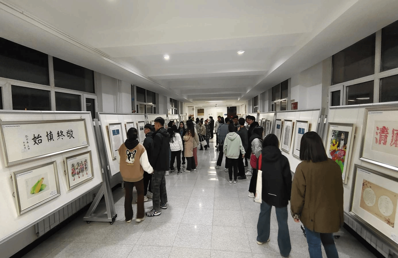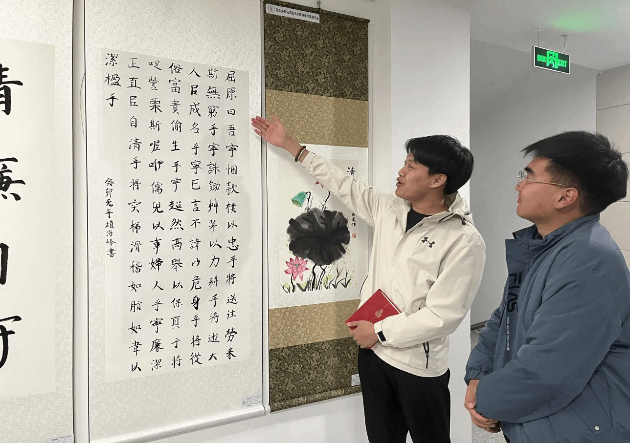 集中学习结束后,党支部组织全体同学走进行政楼3楼走廊参观由各系员工和老师创作的廉政书画作品。