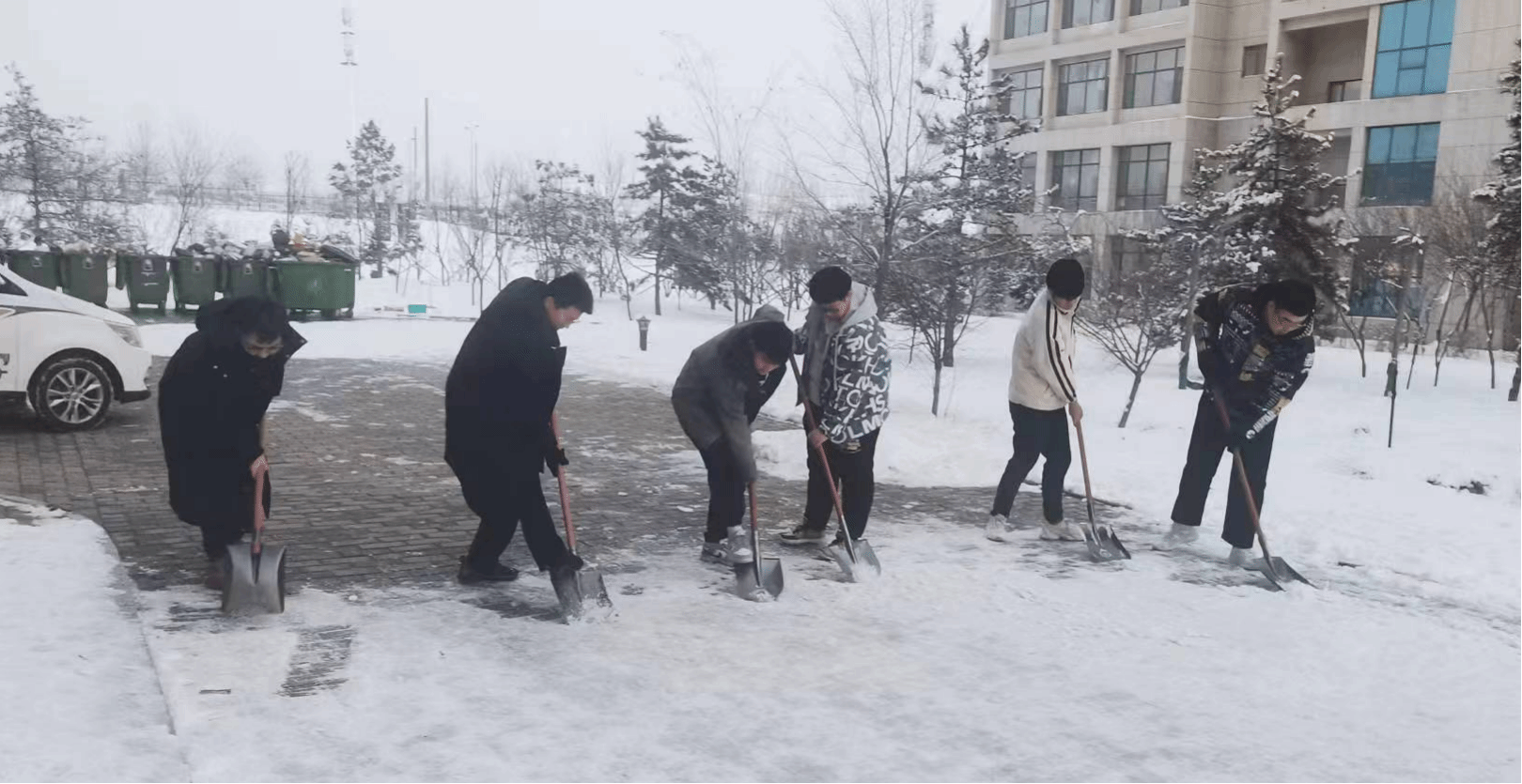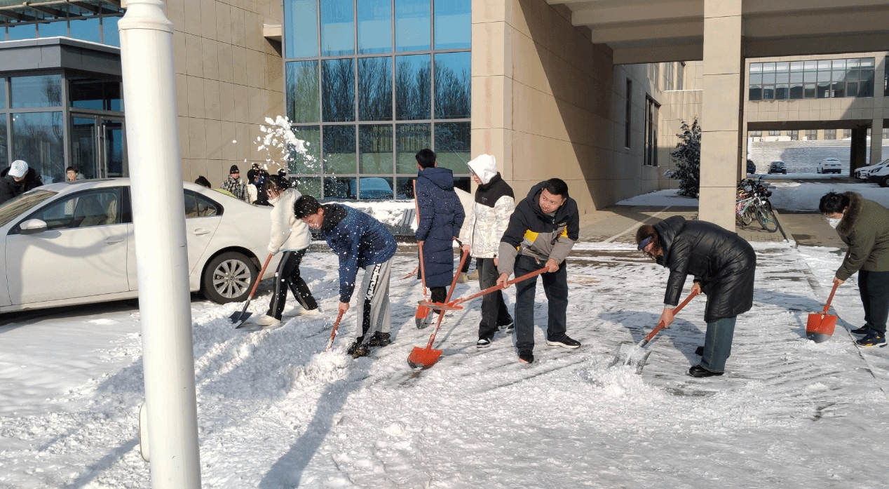 近日因冷空气影响,全区大范围降雪,给公司裹上了一层厚厚的银装。雪后同学们嬉戏打闹有的堆雪人、有的打雪仗,且南方的同学第一次看到雪很是激动。下雪固然会使人心情愉悦,也可以让空气变得更清新,但同时也给老师同学们的出行带来了不便。因此为了保障校园环境整洁、保障师生的安全出行,机械与交通工程系员工第一党支部各积极分子、发展对象以及党员纷纷参与到扫雪除冰活动中,及时为师生清扫出一条“安全路”。
