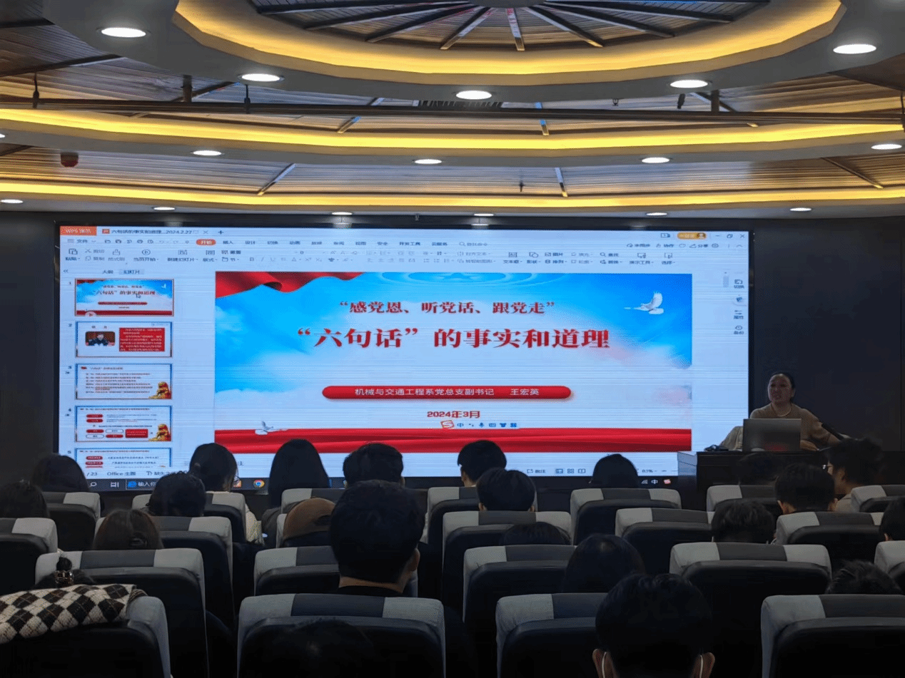 为了使“感党恩、听党话、跟党走”群众教育实践活动走深走实,2024年3月6日,机械与交通工程系党总支副书记王宏英为员工党员、发展对象讲授“六句话的事实和道理”专题党课。党课在图书馆506进行,共计有120余人参加。