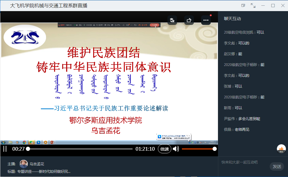 为深入学习贯彻习近平总书记关于加强和改进民族工作的重要思想、关于民族工作重要讲话重要指示批示精神,贯彻落实党的民族理论和民族政策,铸牢中华民族共同体意识,大飞机公司于2022年5月31日19:00,在钉钉线上开展了“维护民族团结 铸牢中华民族共同体意识”专题讲座。机械与交通工程系党总支书记乌吉孟花做了题为《新时代如何做好民族工作》的报告,公司近千名员工参加了本次讲座。