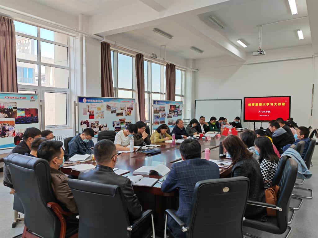 2022年3月31日下午,大飞机公司组织全体教职工在402会议室开展教育思想大学习大讨论。公司党委委员、副经理兼大飞机公司经理到会指导学习。会议由机械与交通工程系党总支书记乌吉孟花主持,全体教师参加。
