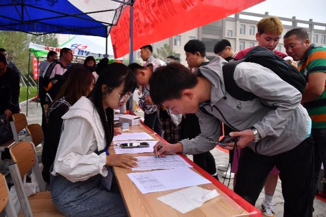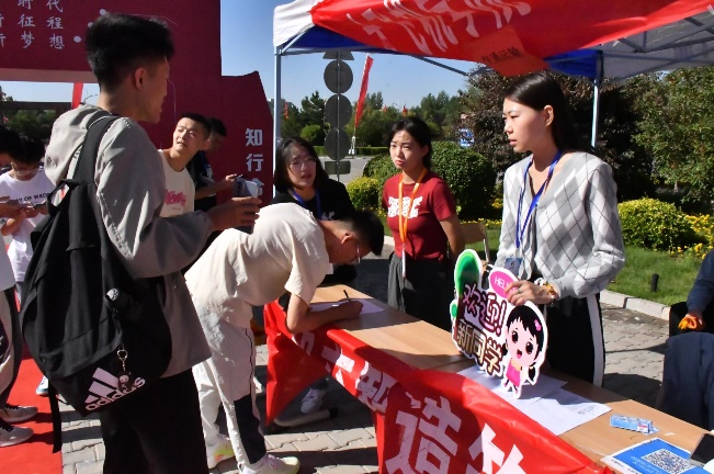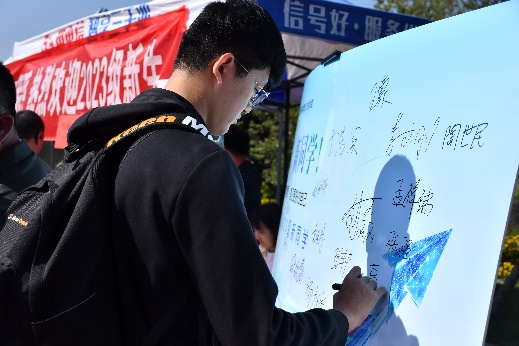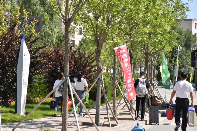 新生报到点设在图书馆前的广场中心。前期院系对场内进行了合理的规划,精心准备,现场热闹非凡,井然有序。