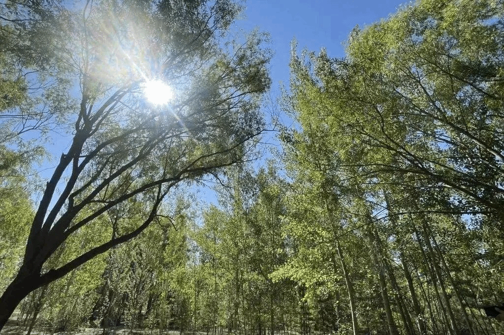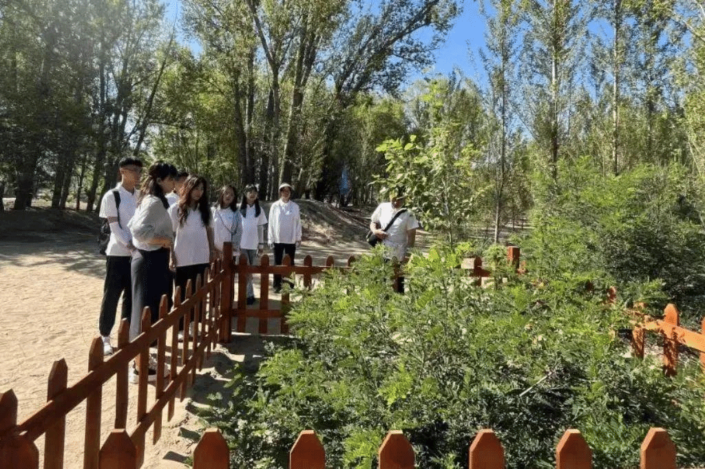 讲解员向实践团介绍,先前的这里连接着三片沙漠,而如今,绿树成荫、生机盎然,灌木类型逐年增加,物种类型日渐丰富,这都源自于国营新华林场三代林场人的不懈努力,63年来风吹日晒,共累计造林3.9万亩、植树430万株,让碱滩变良田、荒漠变林海,用青春和汗水构筑起祖国北疆重要绿色生态屏障。