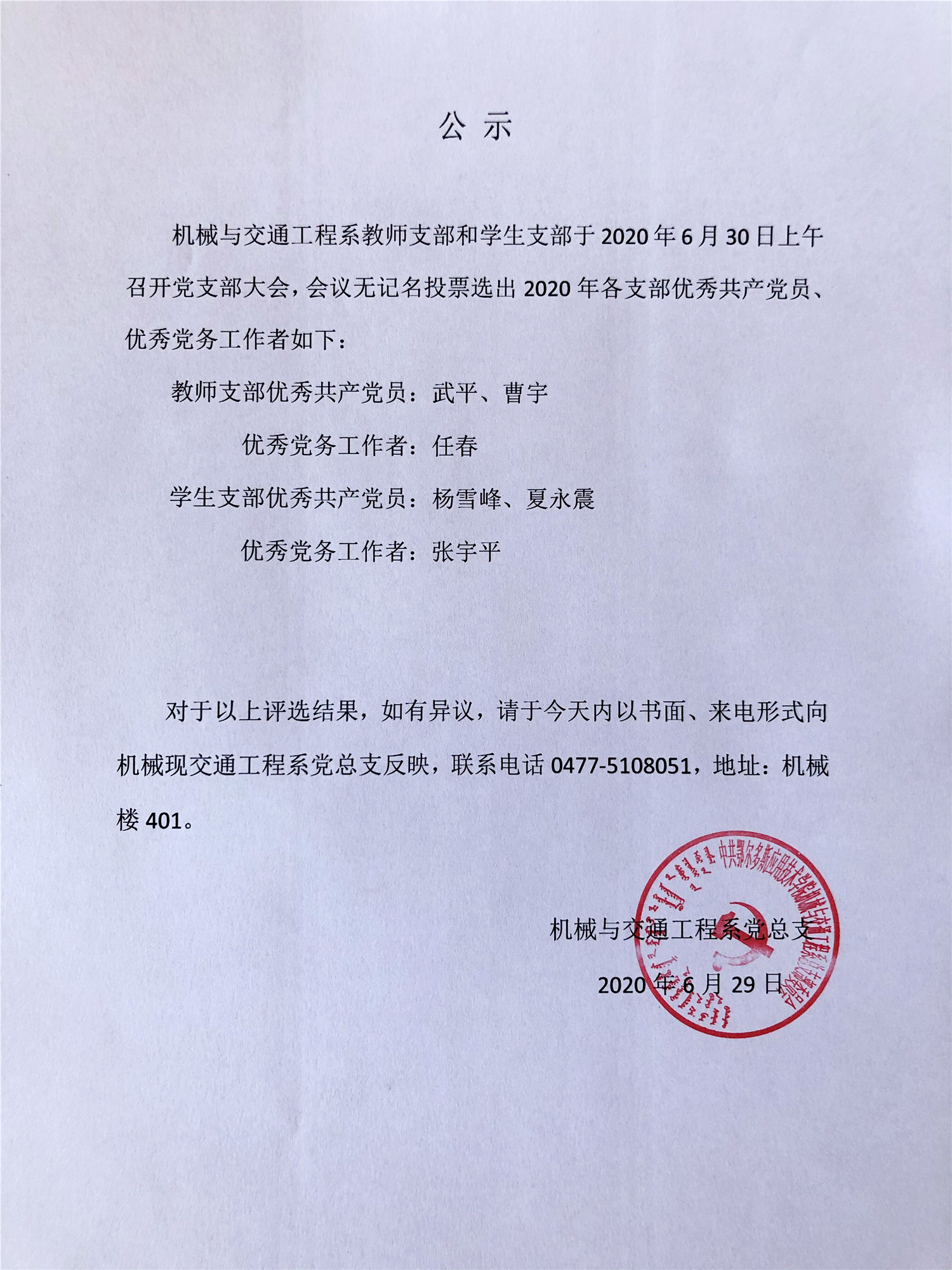 机械与交通工程系党总支2020年优秀党员、优秀党务工作者公示