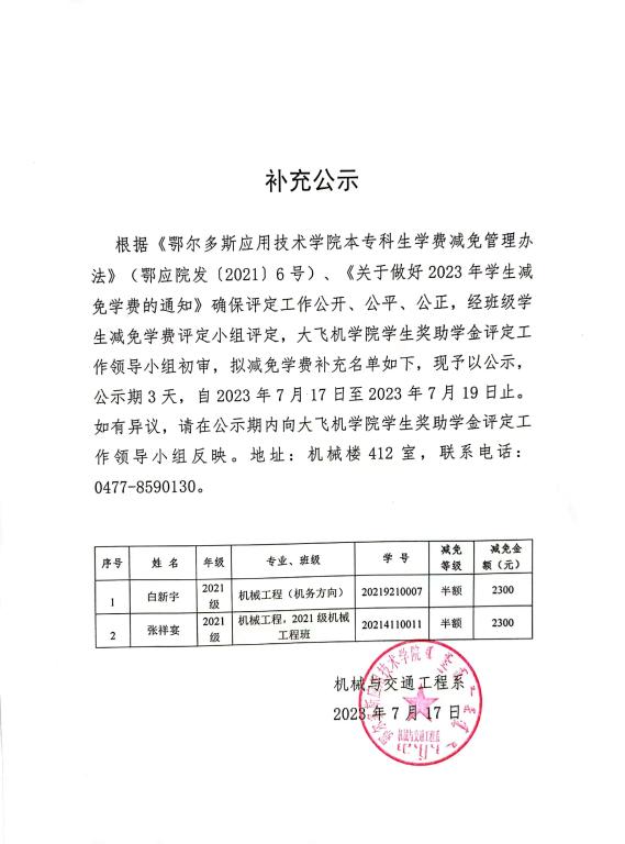 学费减免补充公示