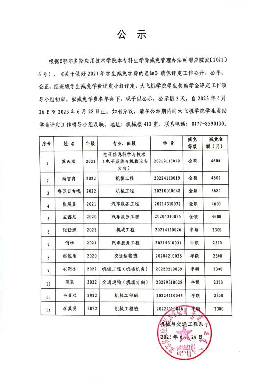 学费减免公示