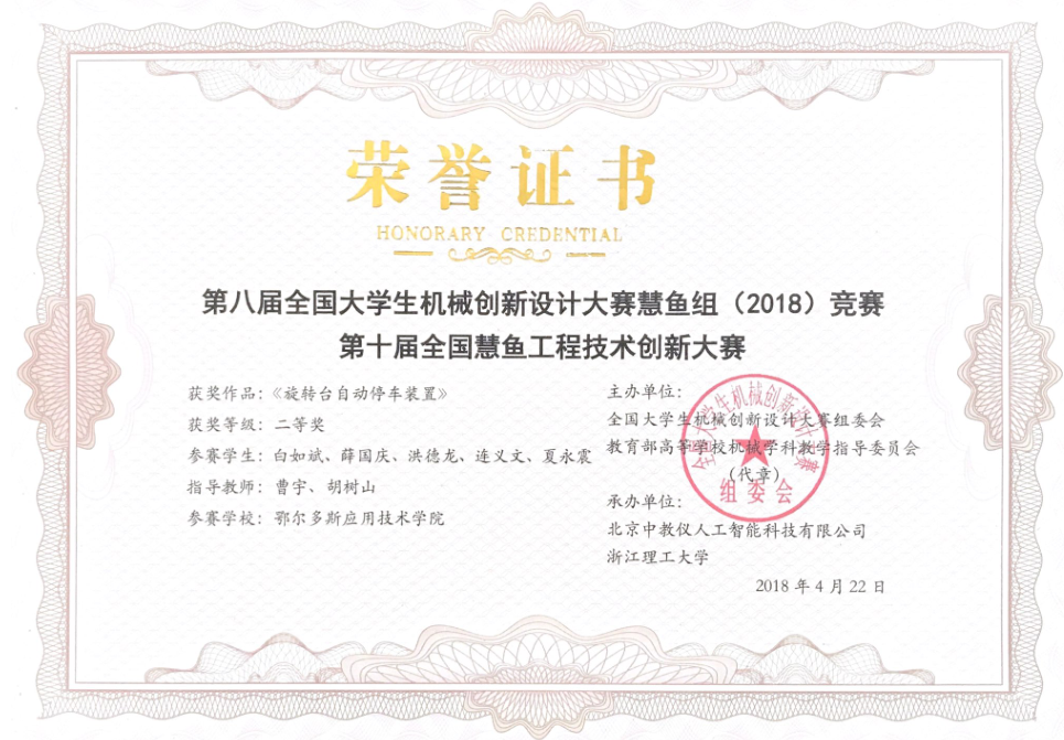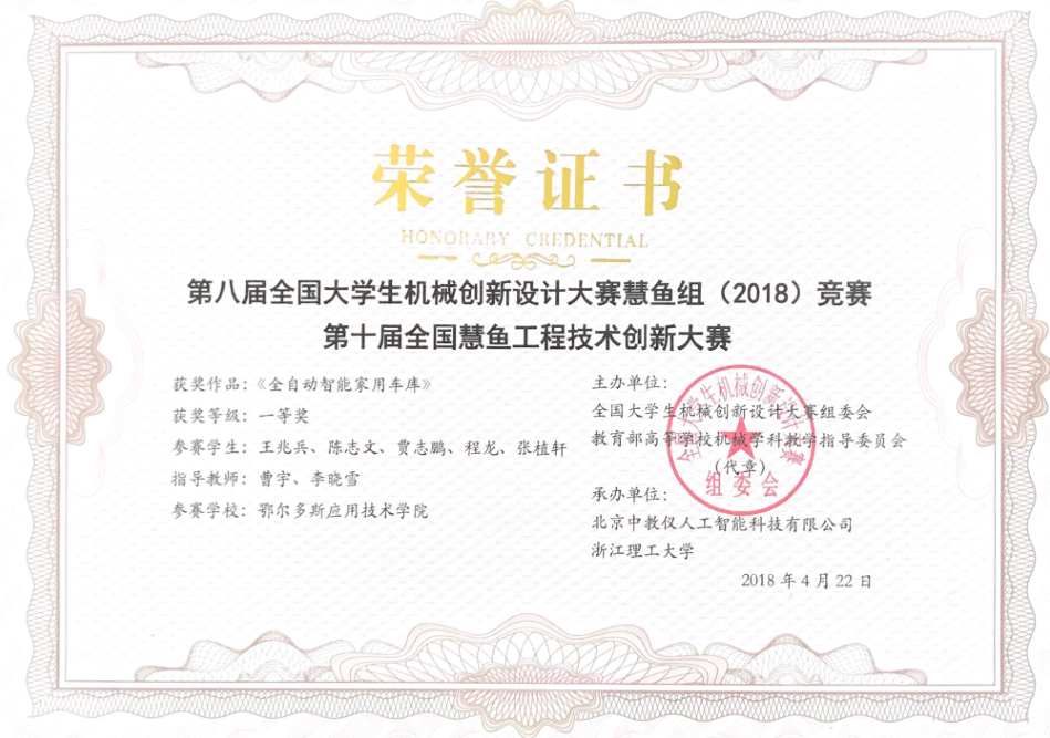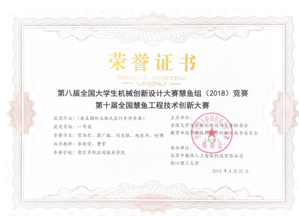 由3044永利李晓雪、曹宇老师指导,机械工程专业员工贾浩东、蔚广毅、付博、刘东胜、赵东升等设计制作的参赛作品《垂直循环式立体自行车停车库》,和由曹宇、李晓雪老师指导,机械工程专业员工王兆兵、陈志文、贾志鹏、程龙、张植轩设计制作的《全自动智能家用车库》通过现场实物演示、专家问辩、答辩及设计图纸资料评审等过程,最终荣获全国一等奖。由曹宇、胡树山老师指导,机械工程专业员工洪德龙、白如斌、夏永震、薛国庆、连义文等设计制作的参赛作品《旋转台自动停车装置》获得全国二等奖。创该项赛事内蒙古高校最好成绩。